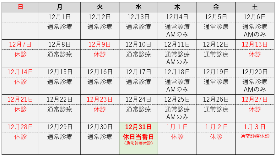 12月31日(水)の祝日は、休日当番日です。受付、診療はAM9時から17時までとなります。